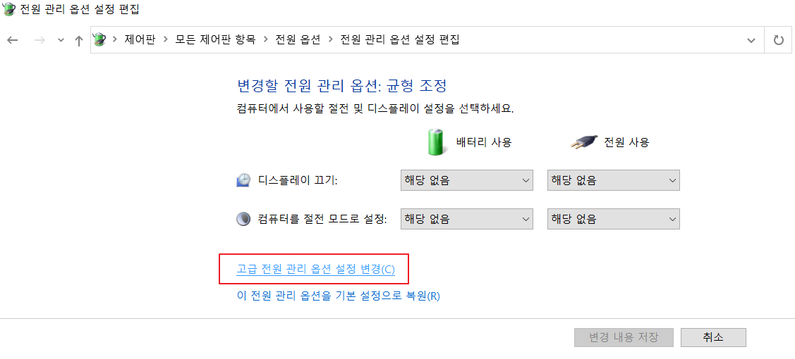 변경할 전원 관리 옵션 메뉴에서 아래쪽의 [고급 전원 관리 옵션 설정 변경] 을 클릭합니다.