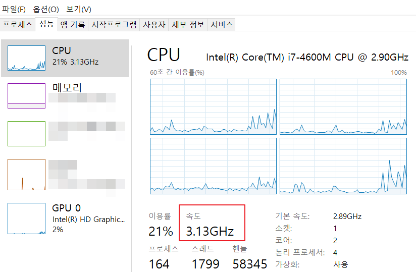 작업표시줄 우클릭 > 작업관리자 > 성능 탭의 CPU 속도 확인