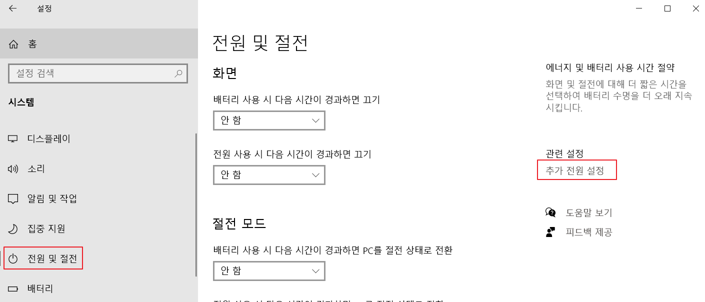 시작 > 설정 > 시스템 > 전원 및 절전 > 우측의 추가 전원 설정