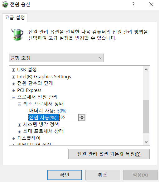 CPU 속도 저하 현상 해결을 위해 [최소 프로세서 상태] 의 값을