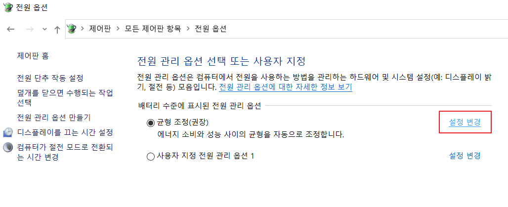 자신이 사용하고 있는 전원 관리 옵션의 [설정 변경] 을 클릭합니다.