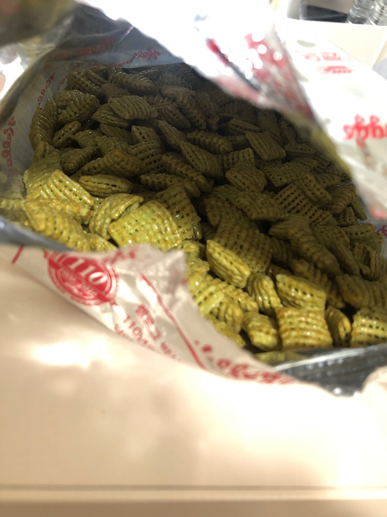 과자의 색깔은 녹색, 풀색을 띄고 있습니다.