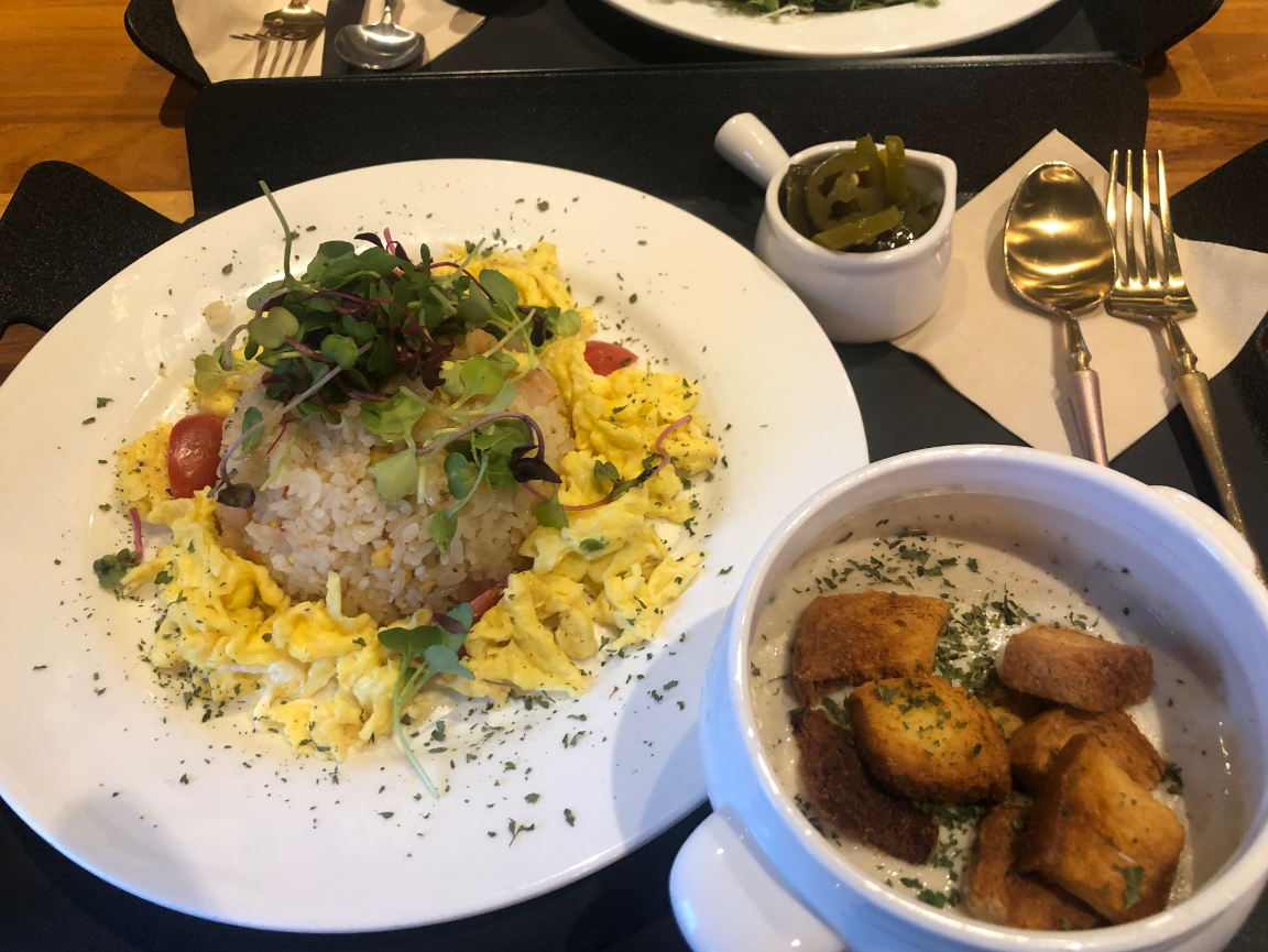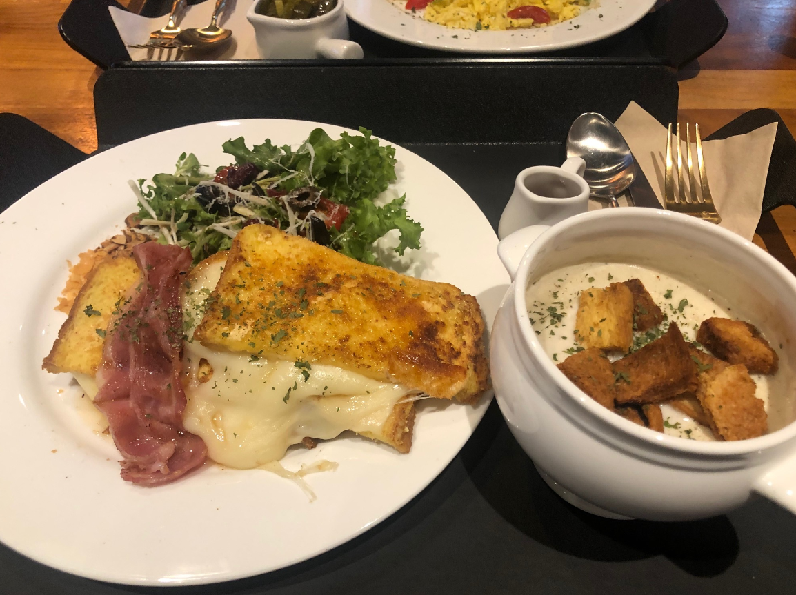 프렌치토스트 & 치즈베이컨, 쉬림프 토마토 에그 필라프 입니다.