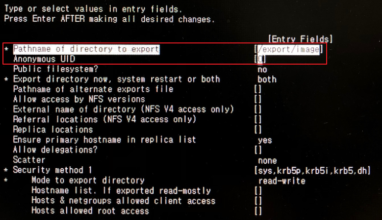 NFS로 설정한 경로인 /export/image와 해당 NFS 옵션을 확인할 수 있습니다.