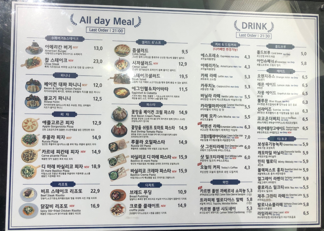 수제버거, 피자, 파스타, 리조또 등 다양한 식사메뉴가 있습니다.