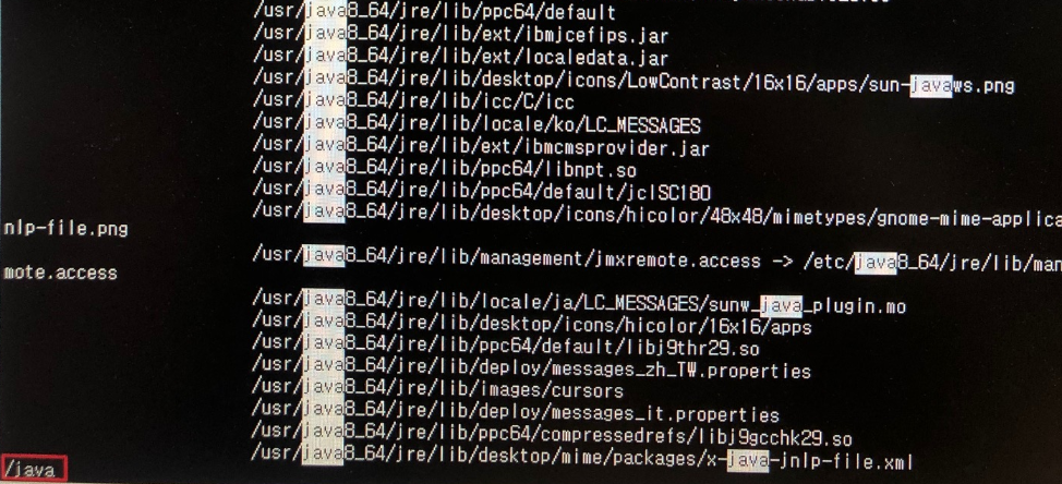 예를 들어 java 가 설치되어 있는지 확인하고 싶다면 아래와 같이 입력합니다.