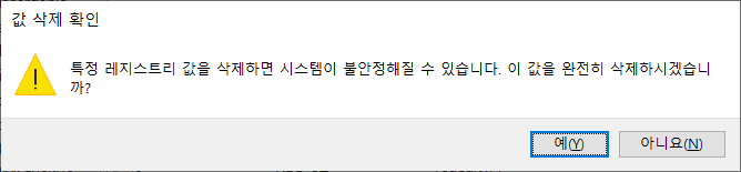 삭제 시 경고 문구가 나오고 여기서 "예(Y)" 를 선택 시 명령어가 삭제됩니다.