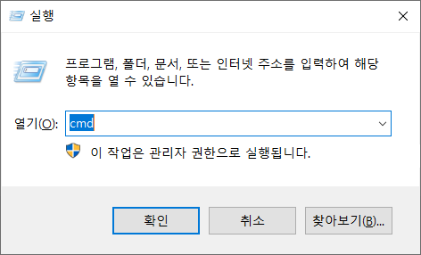 실행 창을 실행시킨 후 (윈도우키 + R, 혹은 시작버튼 우클릭 -> 실행)