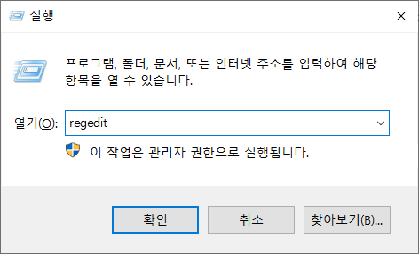 regedit 을 입력하여 레지스트리 편집기를 실행합니다.