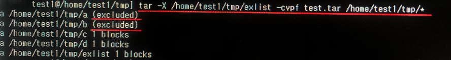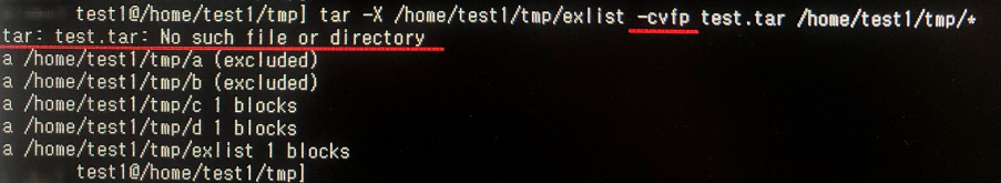 # tar -X /home/test1/tmp/exlist -cvpf test.tar /home/test/tmp/*