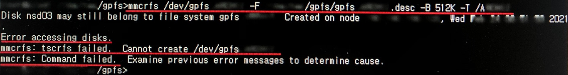 GPFS의 NSD 생성 실패, GPFS 파일시스템 생성 실패할 경우
