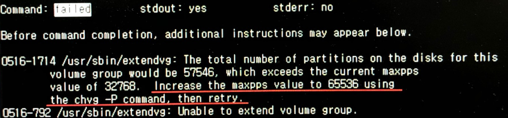 볼륨그룹에 디스크를 추가 할당하려 extendvg 명령 실행 시