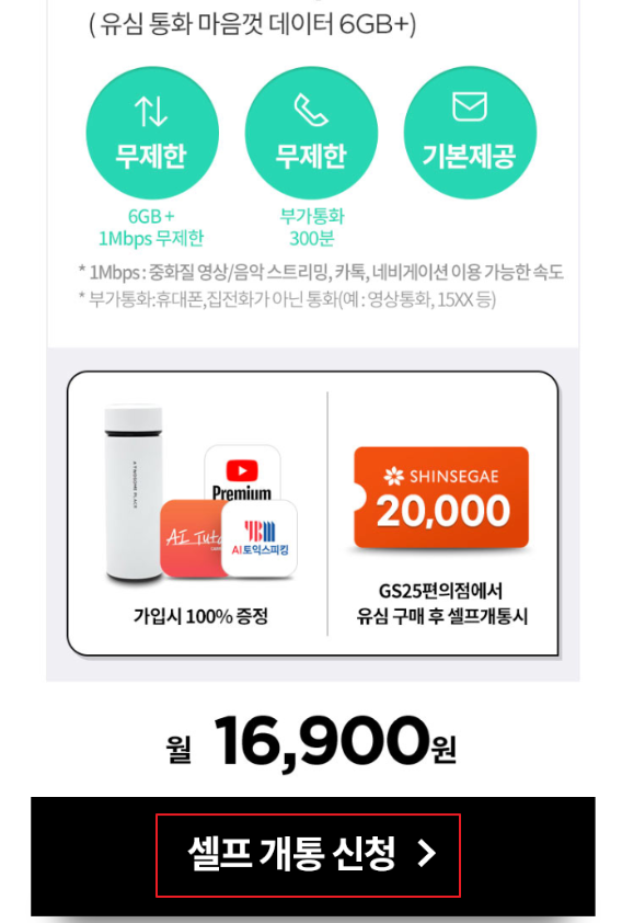 유플러스 알뜰 모바일의 유심 통화마음껏 데이터 6GB+ 요금제로 결정하였습니다.