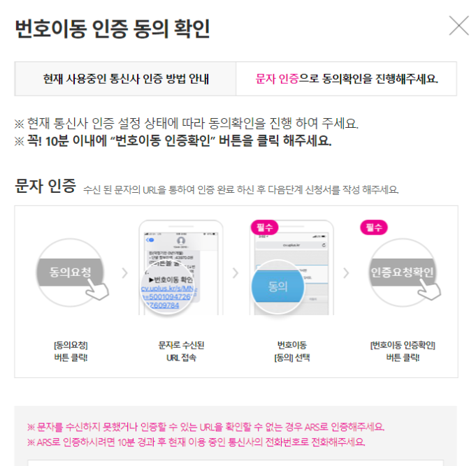 번호이동 시 기존에 사용하던 통신사의 핸드폰으로 확인 문자가 수신됩니다.