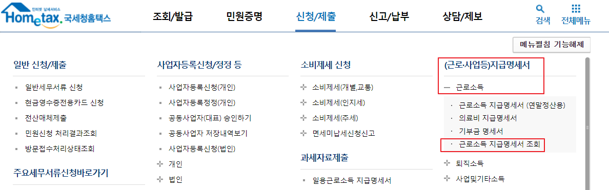 (근로.사업등)지급명세서 항목의 근로소득 > 근로소득 지급명세서 조회를 선택합니다.