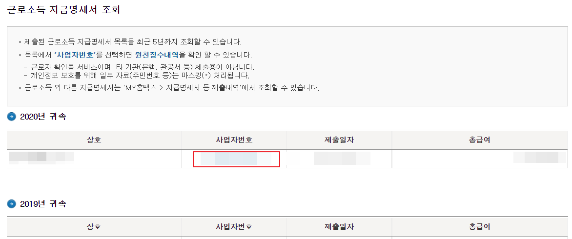 최근 5년간의 원천징수 영수증 (근로소득 지급명세서) 을 조회할 수 있습니다.