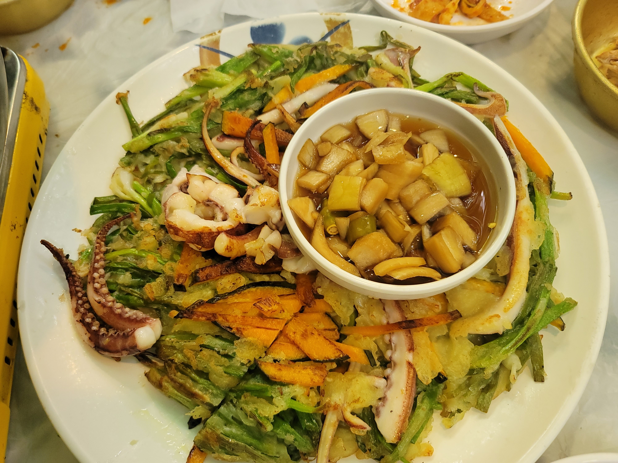 파전은 바삭하고 오징어가 큼직하게 들어 있어서