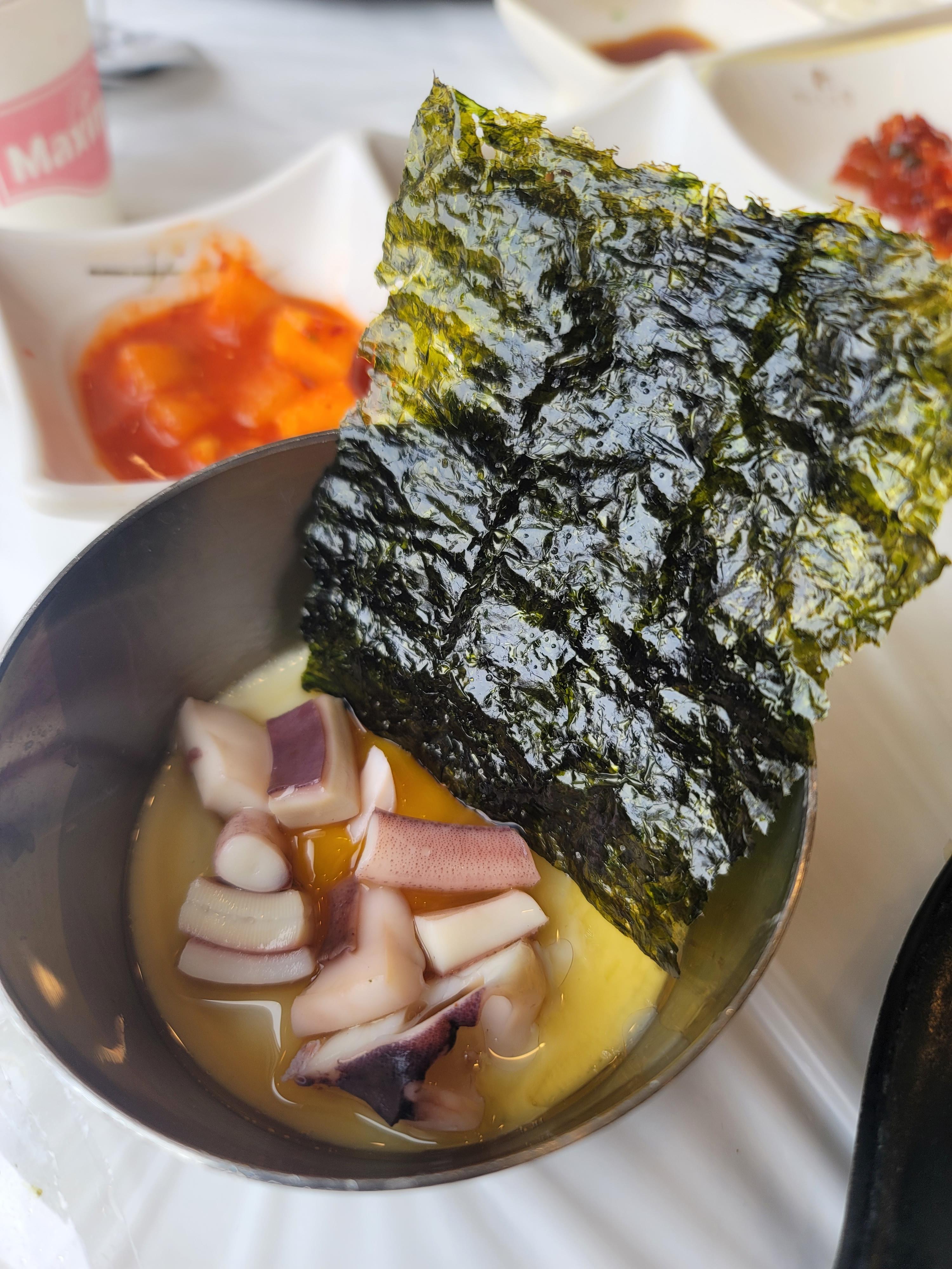 오징어의 뽀독한 식감과 김의 짭쪼름함이 수란에 섞여 녹아들어서 맛있었다..