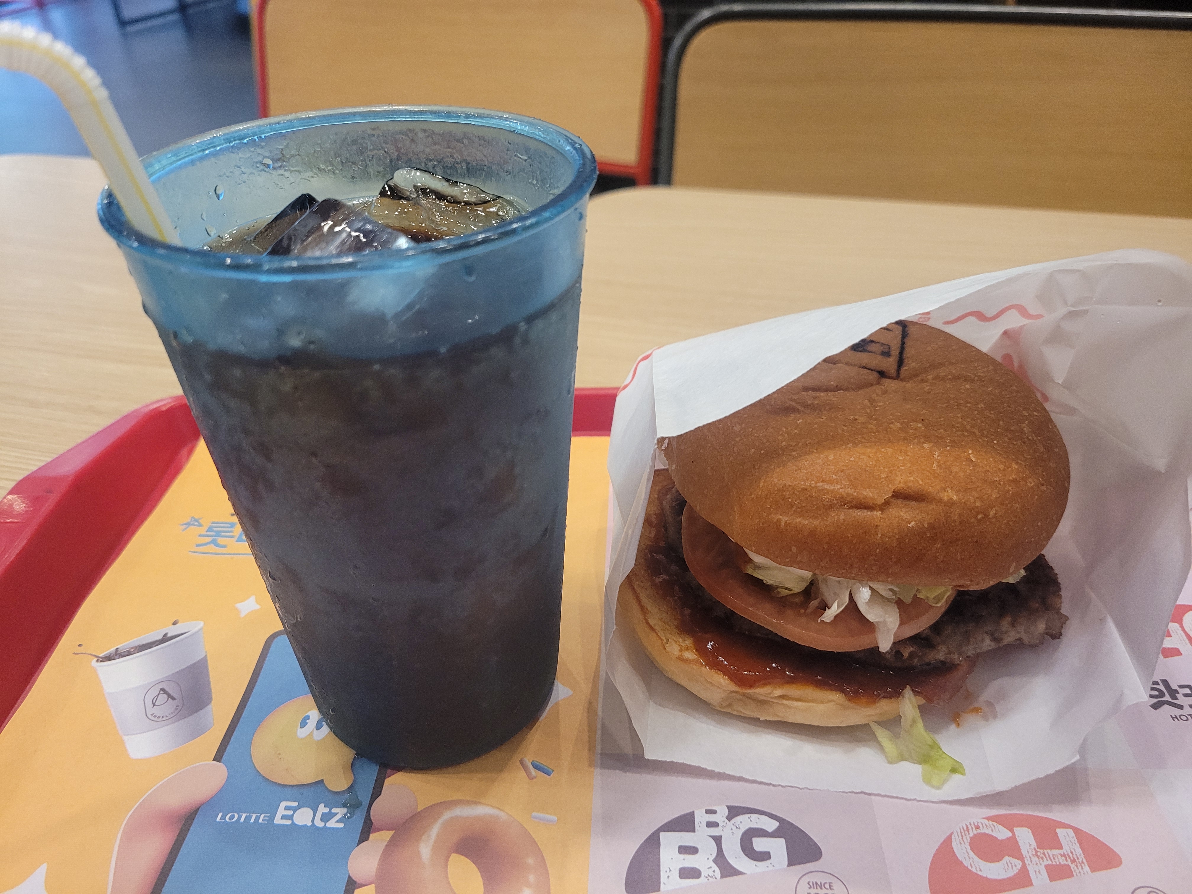 점심으로 햄버거 먹고,