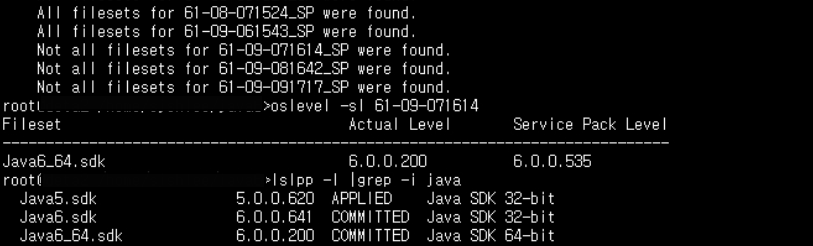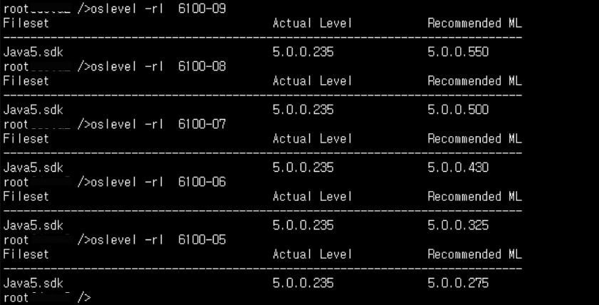 위 결과에서는 Java5.sdk를 5.0.0.550 버전 이상으로 올린다면, oslevel 명령을 통해 AIX6.1 TL09 버전까지 출력이 가능하다.
