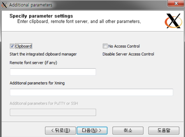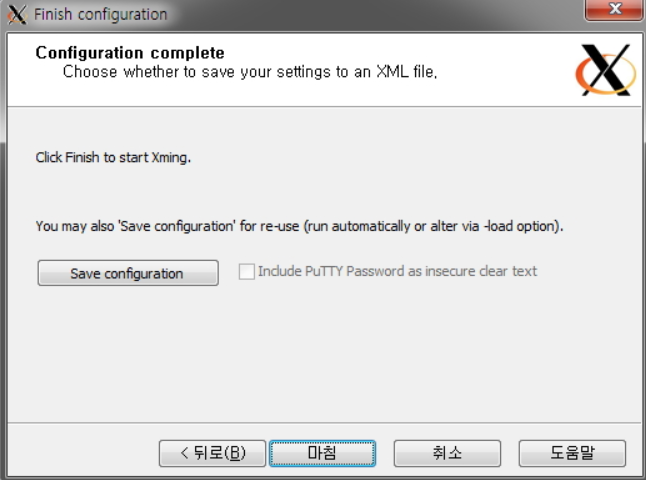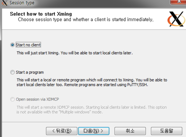2. 아래 화면과 같이 설정 후 종료하면 xming이 실행됩니다.