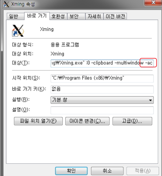 xming 실행파일의 속성에 옵션을 적용하여 재실행