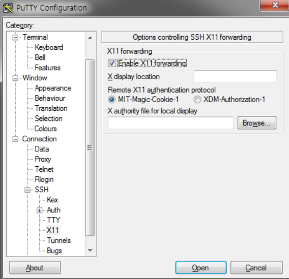 X display location 은 공란으로 두거나 localhost:0 입력 후 Open 버튼 눌러 터미널 시작
