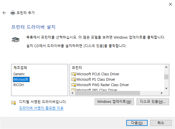 Microsoft Print to PDF 프린터 드라이버 목록이 보이지 않아 설치할 수 없는 경우