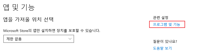 시작 > 설정 > 앱 > 프로그램 및 기능 선택