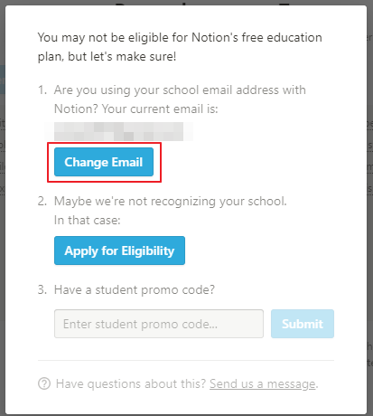 Education plan은 Notion 가입 시 입력한 Email 주소 대신 학교의 Email 주소로 업데이트해야 사용할 수 있습니다.