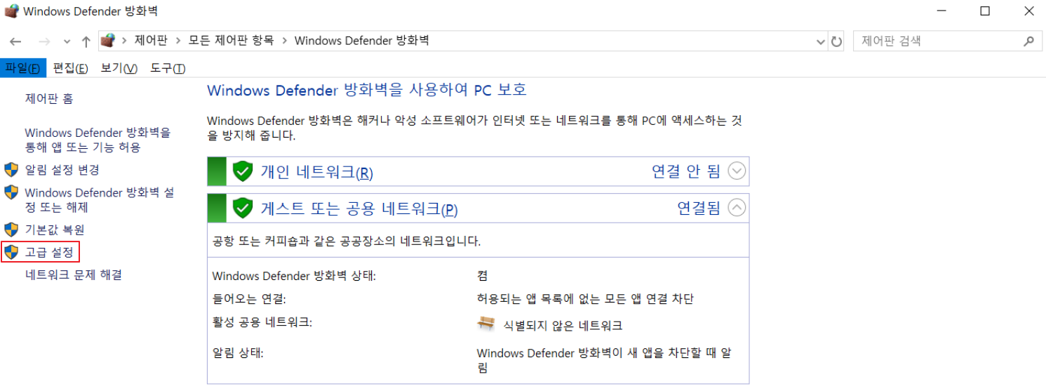 Windows Defender 방화벽 을 실행한 후 고급설정을 선택합니다.