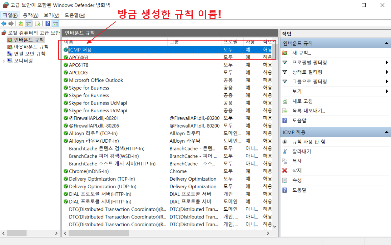 만약 방화벽의 [인바운드 규칙] 에서 [파일 및 프린터 공유 (에코 요청 - ICMPv4-In) / 공용] 항목을 찾을 수 없다면